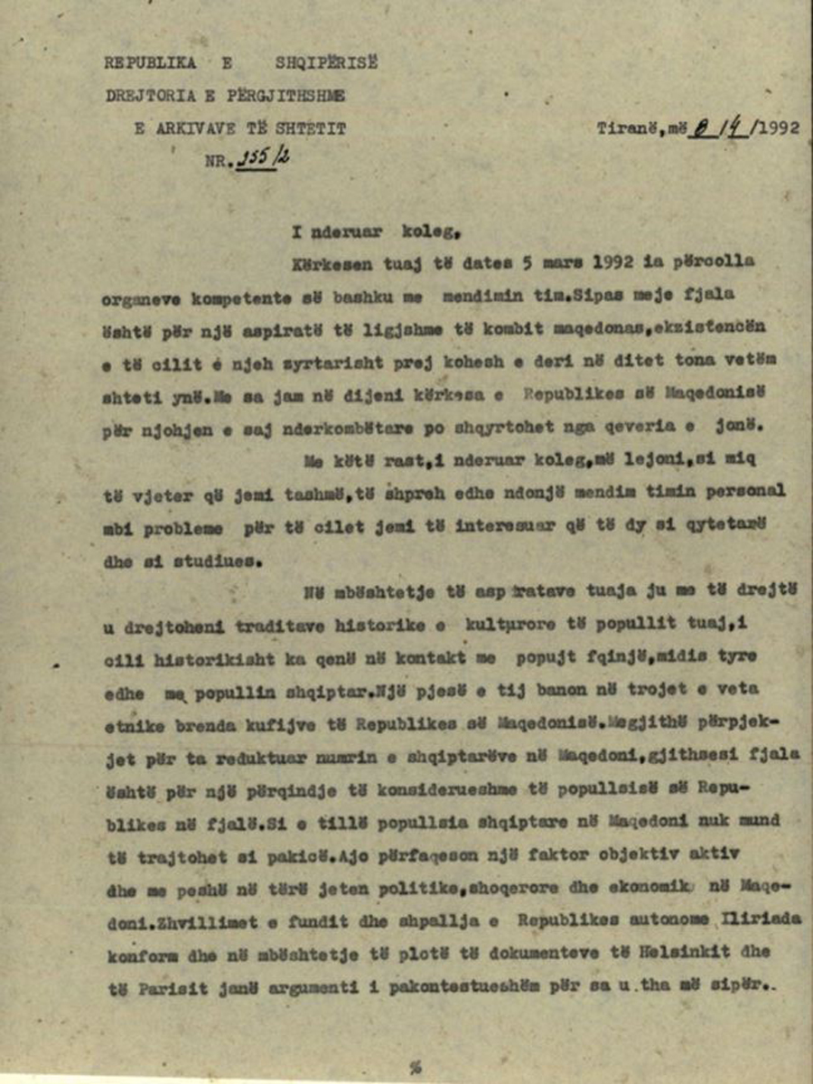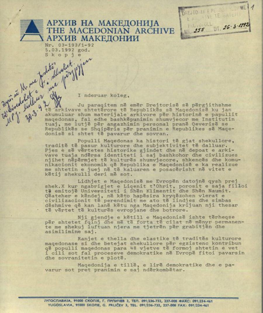 Ju paraqitem në emër të Drejtorisë së përgjithshme të arkivave shtetërore të Republikës së Maqedonisë ku janë akumuluar shumë materiale arkivore për historinë e popullit maqedonas, fal edhe bashkëpunimin shumëvjeçar me Institutin tuaj, me lutje për angazhimin personal pranë Qeverisë së Republikës së Shqipërisë për pranimin e Republikës së Maqedonisë si shtet të pavarur dhe sovran.