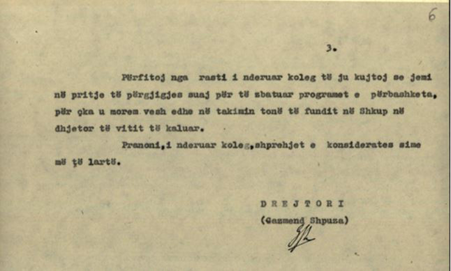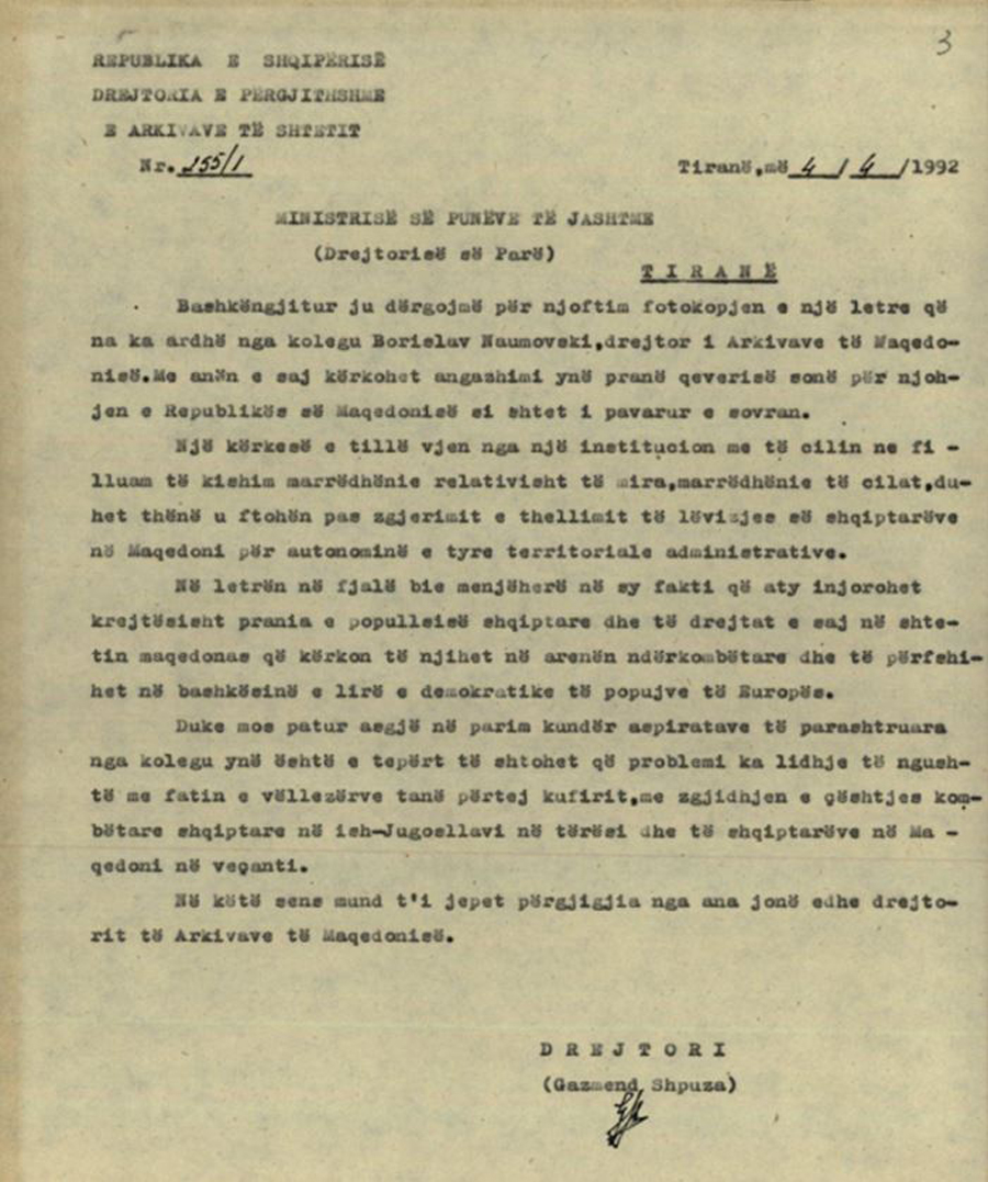 Letra e drejtorit të Arkivit të Maqedonisë, Borisllav Naumovski (e cila është shkruar me një shqipe të bastarduar), si dhe dy letrat e drejtorit të Arkivit të Shqipërisë, Gazmend Shpuzës, ruhen në Arkivin Qendror të Shtetit në Tiranë, fondi 507, të cilat enkas për lexuesit e gazetës KOHA, po i japim të plota.