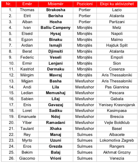 Trajneri i Kombëtares shqiptare, Christian Panucci ka publikuar sot listën e futbollistëve që ka grumbulluar për dy ndeshjet e radhës që do të luajë Shqipëria. Ndeshjen e parë, kuqezinjtë do ta luajnë përballë Skocisë në datën 17 nëntor ora 20:45 në stadiumin “Loro Borici”, e vlefshme për Ligën e Kombeve. Ndeshja e dytë e Kombëtares do të jetë miqësore, Shqipëri – Uells, e cila do të zhvillohet më 20 nëntor në “Elbasan Arena” ora 20:00.