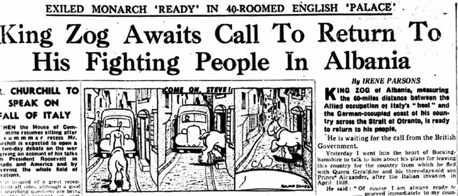 Mbreti Zog i Shqipërisë, duke matur distancën 60 milje midis pushtimit aleat të “thembrës” së Italisë dhe bregdetit të pushtuar nga gjermanët në vendin e tij përtej ngushticës në Otranto, është gati të kthehet te populli i tij. Ai është në pritje të thirrjes nga qeveria britanike. Dje shkova në zemër të Buckinghamshire për të folur me të për planet e tij për t’u larguar nga ky vend për në vendin nga i cili u arratis me mbretëreshën Geraldinë dhe djalin e tij tre-ditor, Princin Aleksandër, pas pushtimit italian në prill 1939.